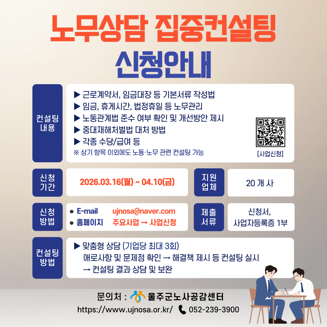 2026년도 울주군노사공감센터 3월 노동법교실을 아래와 같이 공지합니다. 자세한 교육일정은 교육신청 화면에서 확인 부탁드립니다. 2026년 3월...