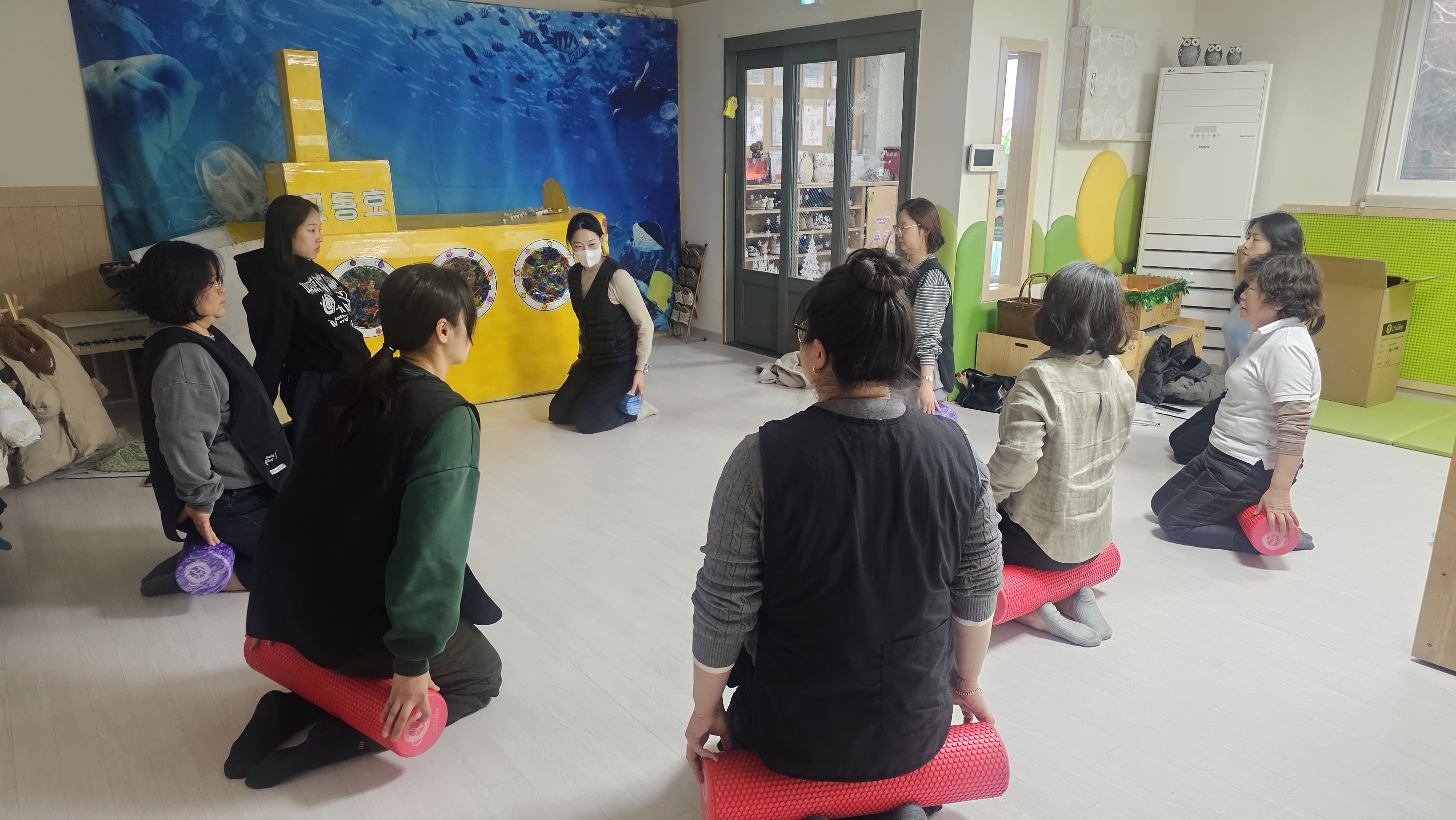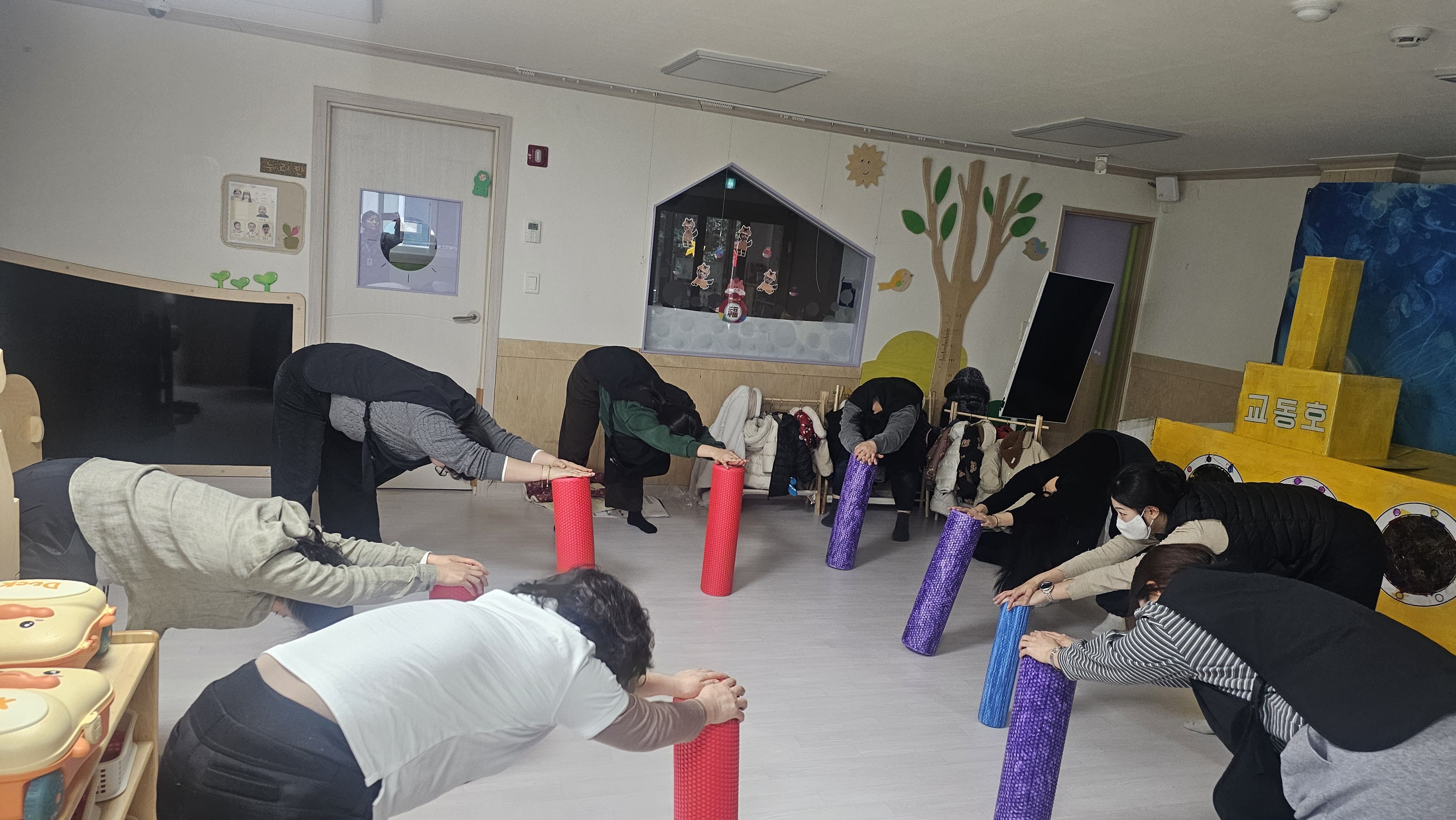 교육내용: 폼룰러를 이용하여 근육풀기, 거북목 예방, 스트레칭등 운동 방법 교육