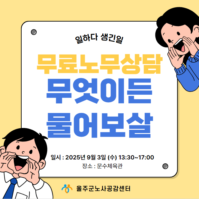 울주군 노사공감센터는 2025년도 울산여성일자리박람회에 참여하여, "무료노무상담"을 지원할 예정입니다.