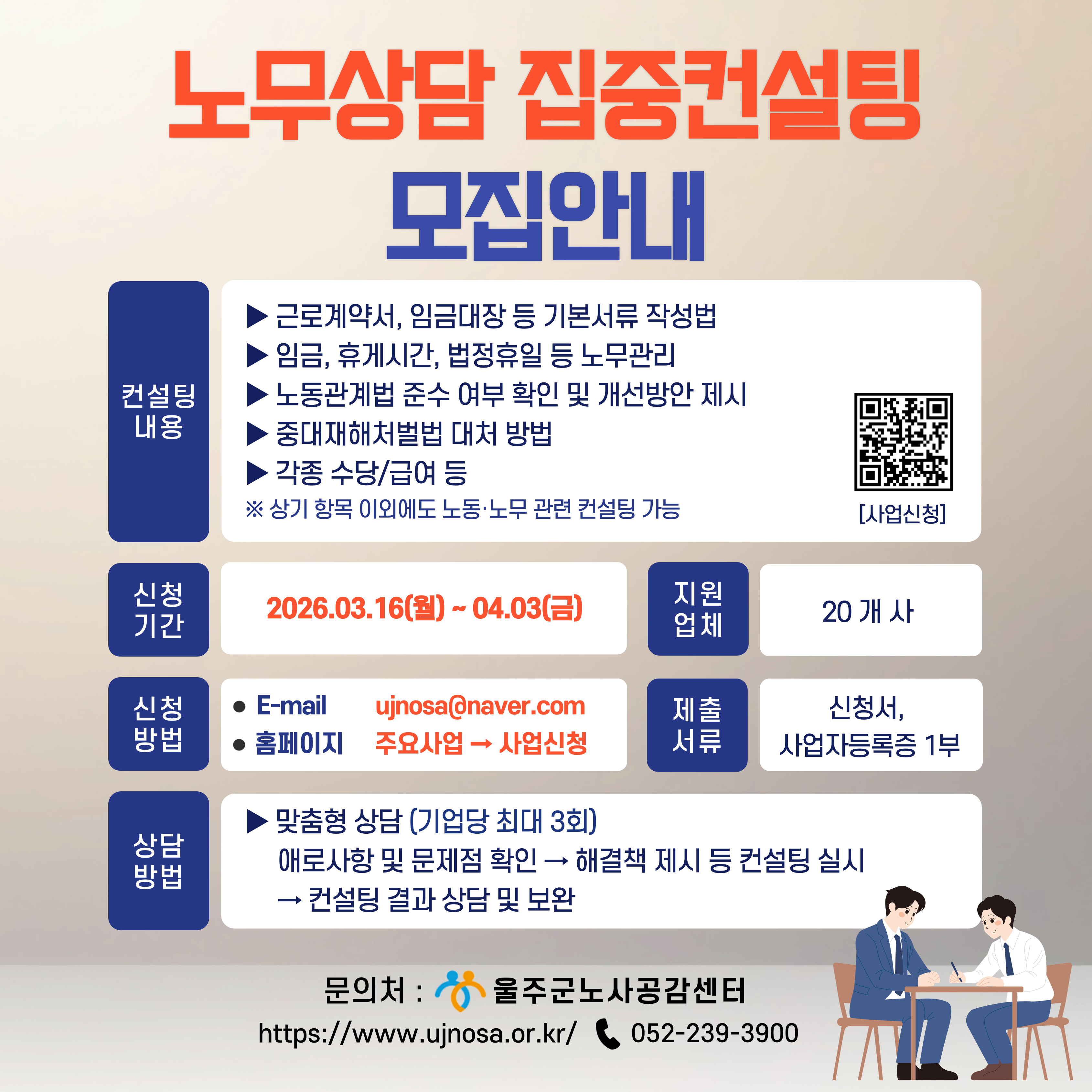 [모집준비중] 상반기 노무상담집중컨설팅은 2026.03.26일 부터 2026.04.10일까지 선착순 으로 모집합니다.