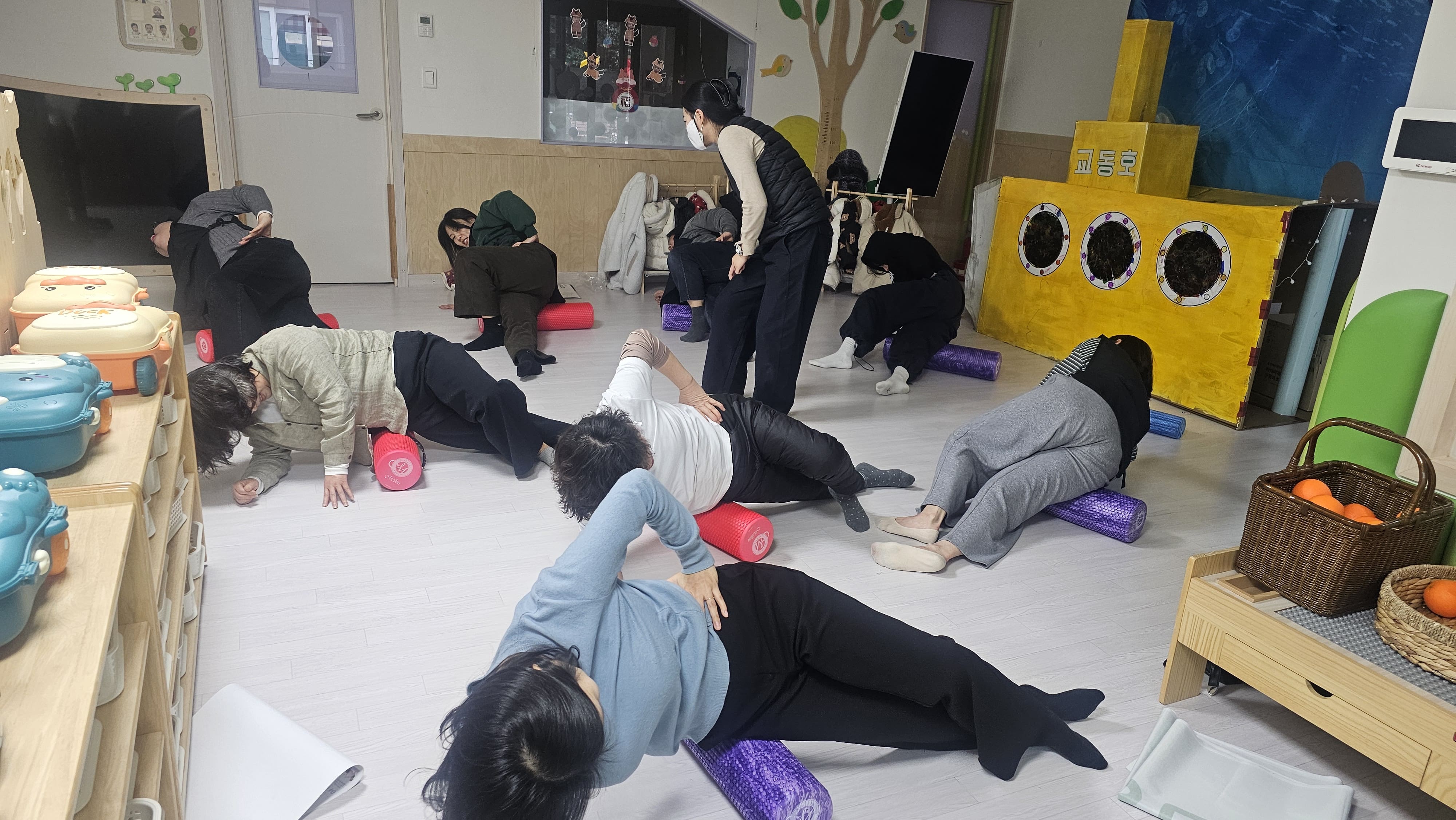 교육내용: 폼룰러를 이용하여 근육풀기, 거북목 예방, 스트레칭등 운동 방법 교육