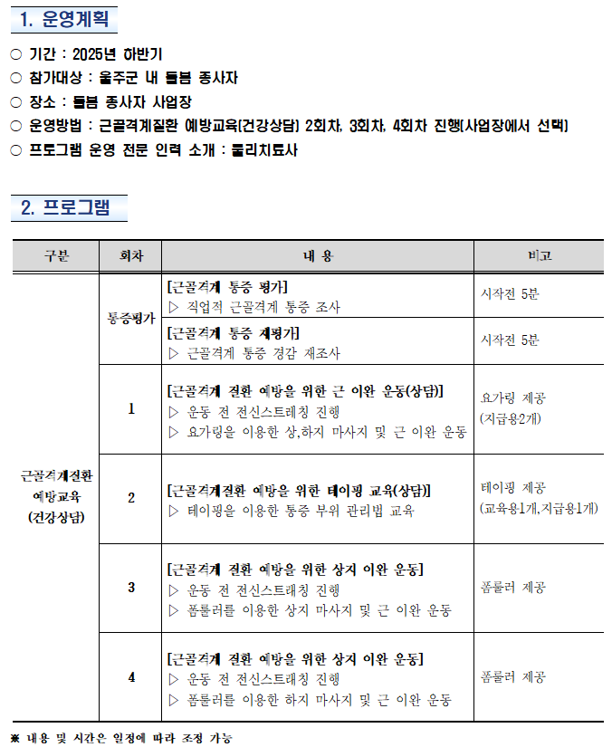프로그램은 현장 맞춤형 교육, 운동 처방, 자세 교정 등 실질적인 예방 중심의 내용으로 구성되어 있습니다.